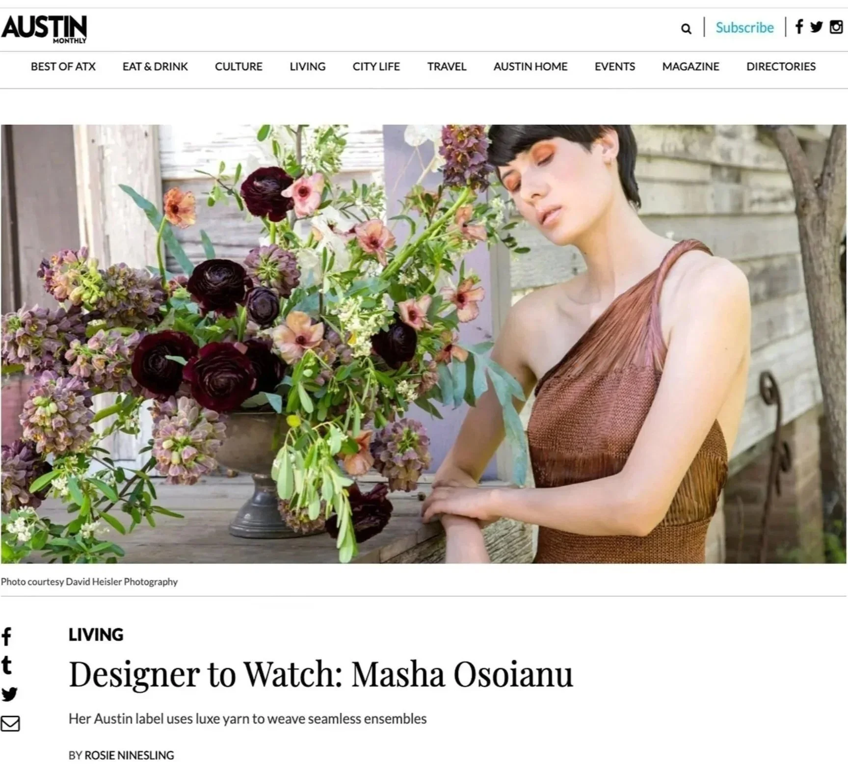Masha Osoianu is a designer celebrated for her one-of-a-kind, hand-knit and crocheted wearable art. With over 15 years of experience working closely with clients, her work is defined by individuality, precision, and exquisite craftsmanship. Featured in Vogue, Austin Fashion Week, and Seattle Met Magazine, Masha has built a reputation as a trailblazer in contemporary fashion.